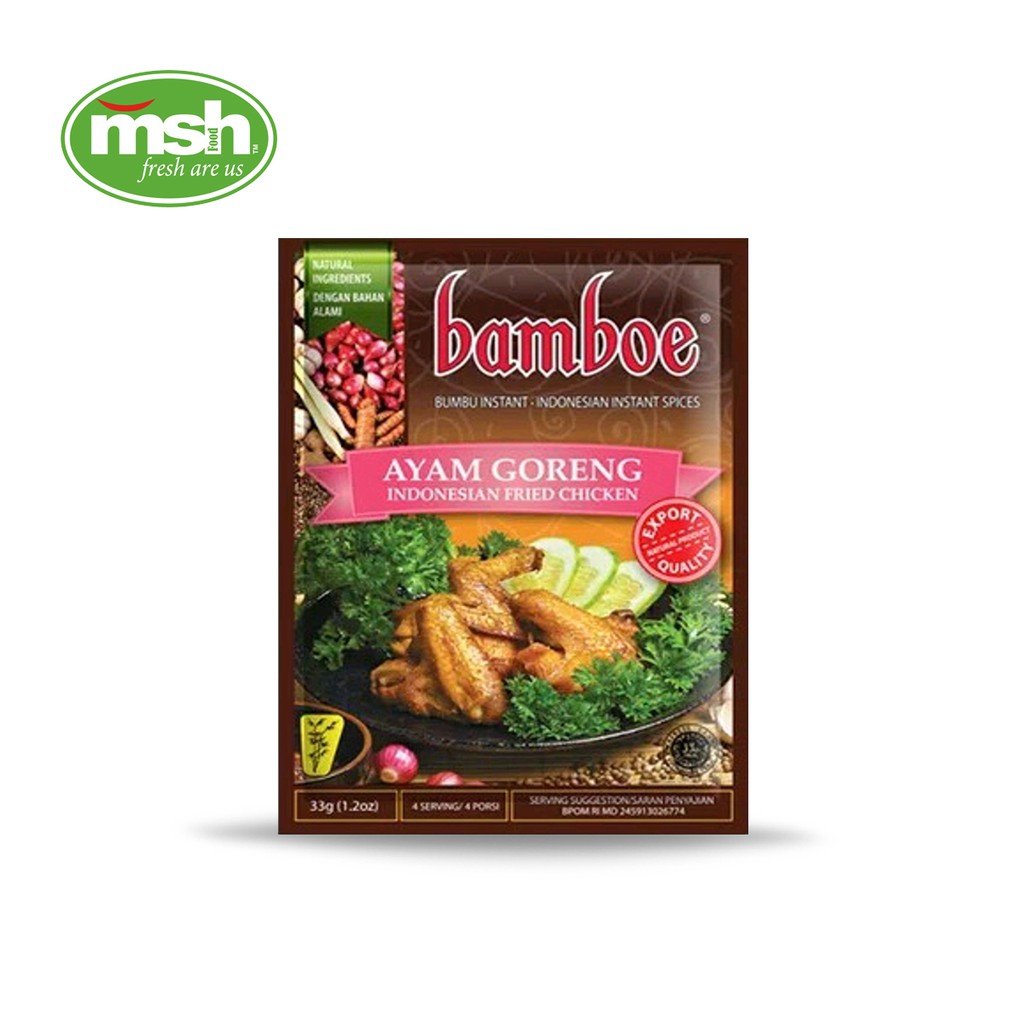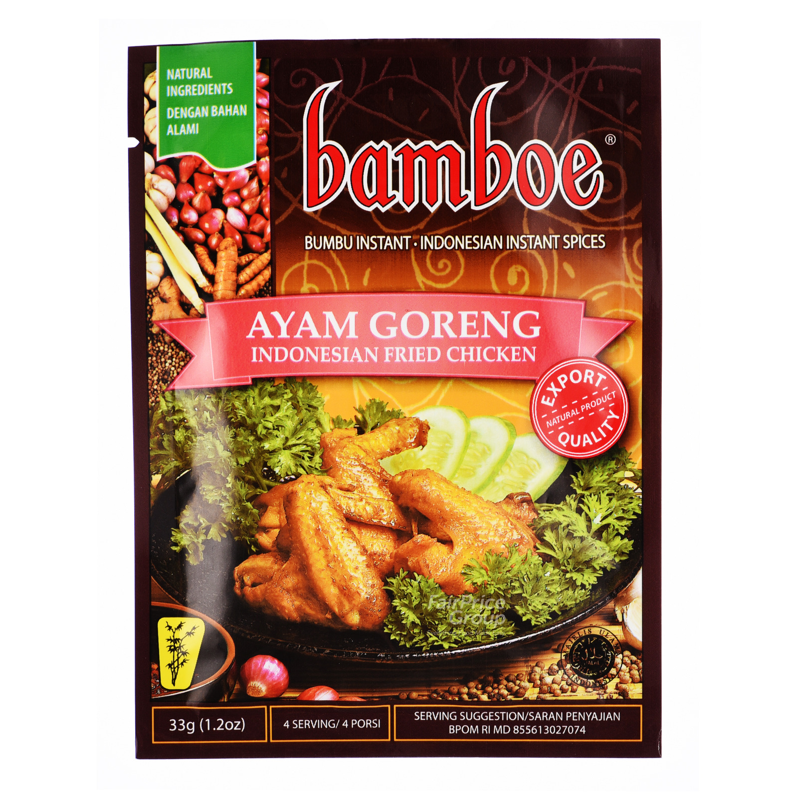 Bamboe Bumbu Instant Ayam Goreng Indonesisches gebratenes Huhn 33g Instant-Gewürze die seit 1968 bekannt sind. Bamboe instant spices is an easy way to prepare Indonesian dish. Bamboe Instant Spices is ready-to-cook authentic Indonesian recipe made only from the freshest natural ingredients.